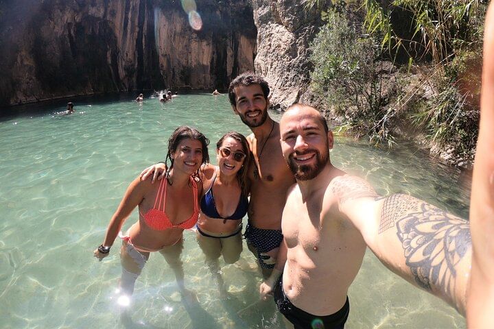El tour es 2:30 h. el transporte de ida y vuelta, más 30 min. de senderismo, más 2 h. en las aguas termales, 1:30 h. de comida y 1.30 h. en el salto de la novia.